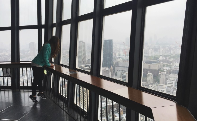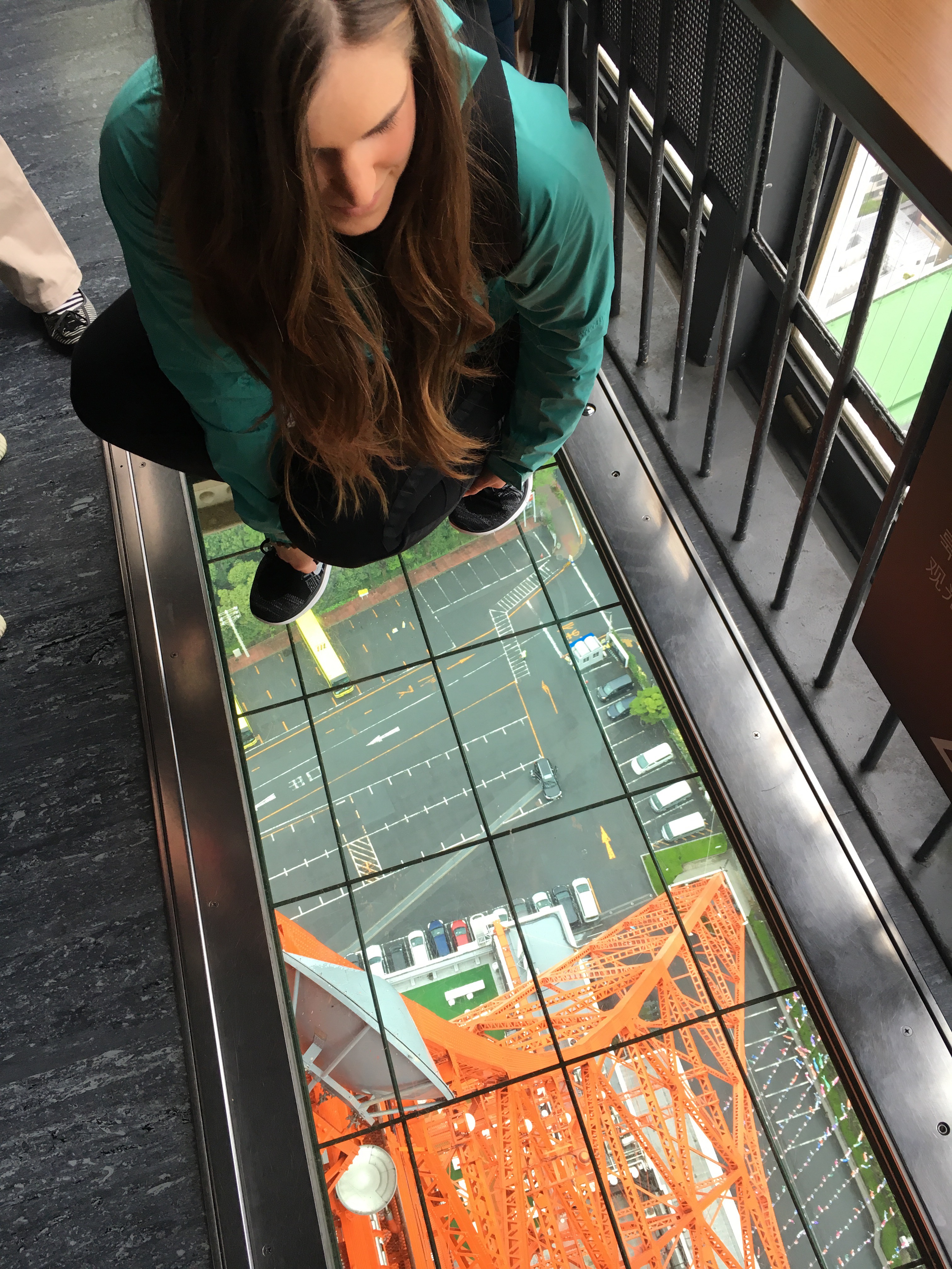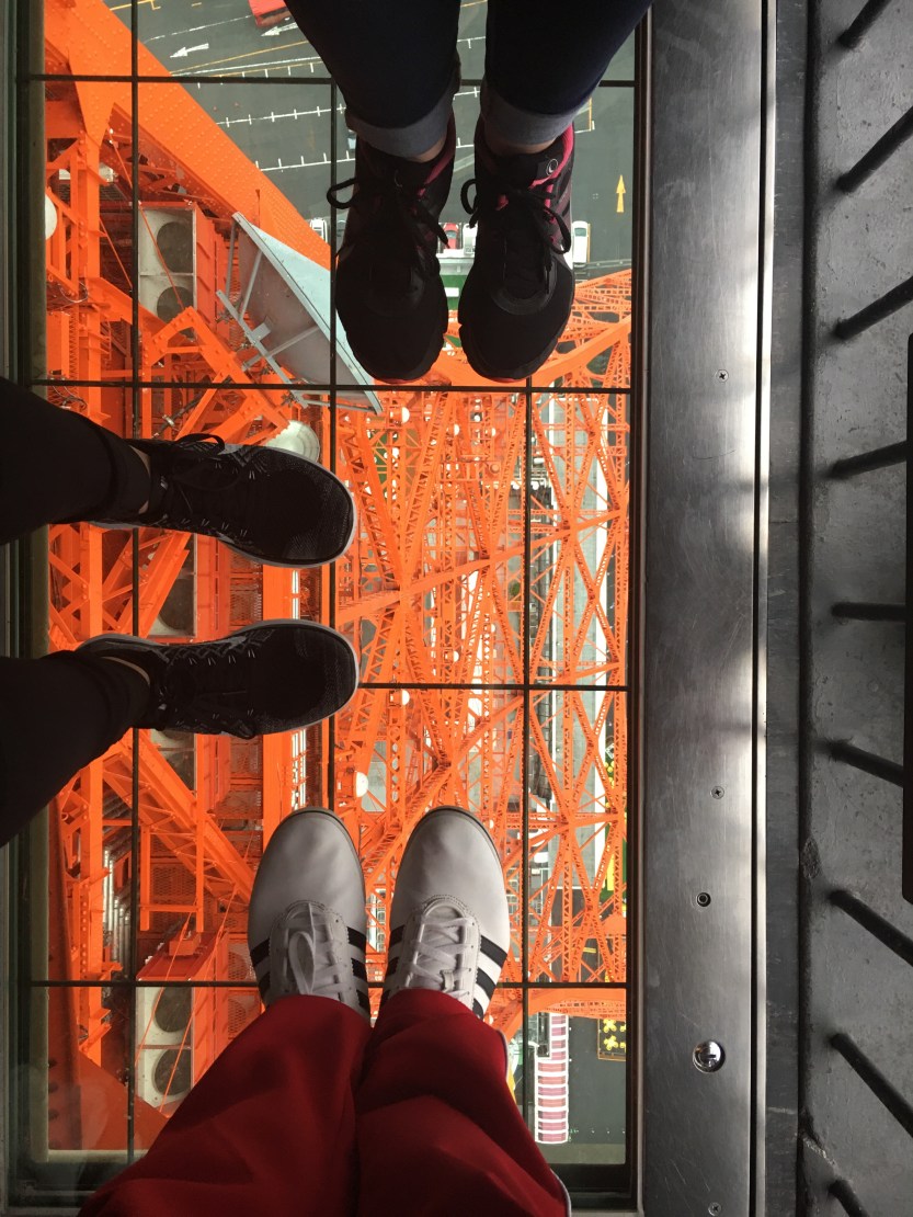 Our first stop was Tokyo tour. We were able to go up to the observation deck, which was 150m tall. The dreary look of the city was so beautiful in the morning. The light fog and the tall buildings, very picturesque. There was a look down point in the tower too where you could step on glass, look down, and see the base of the tower.