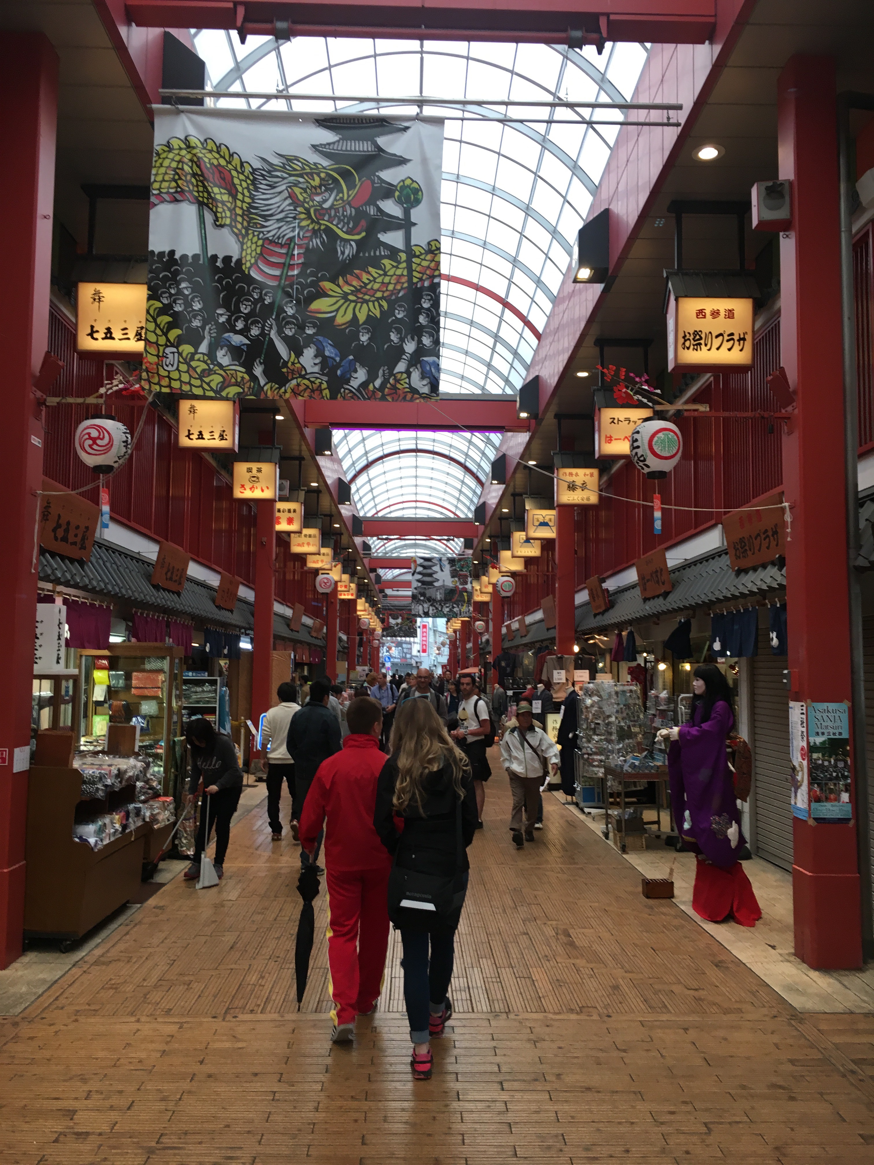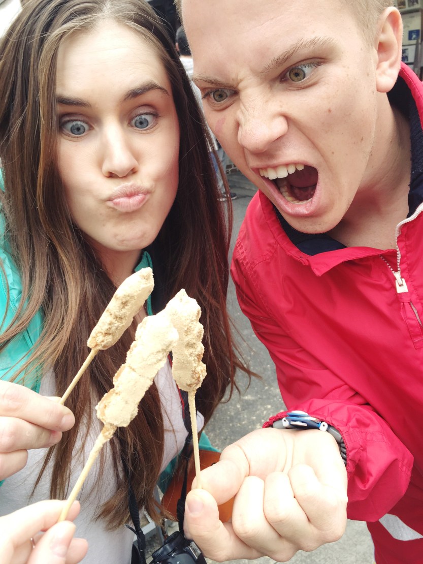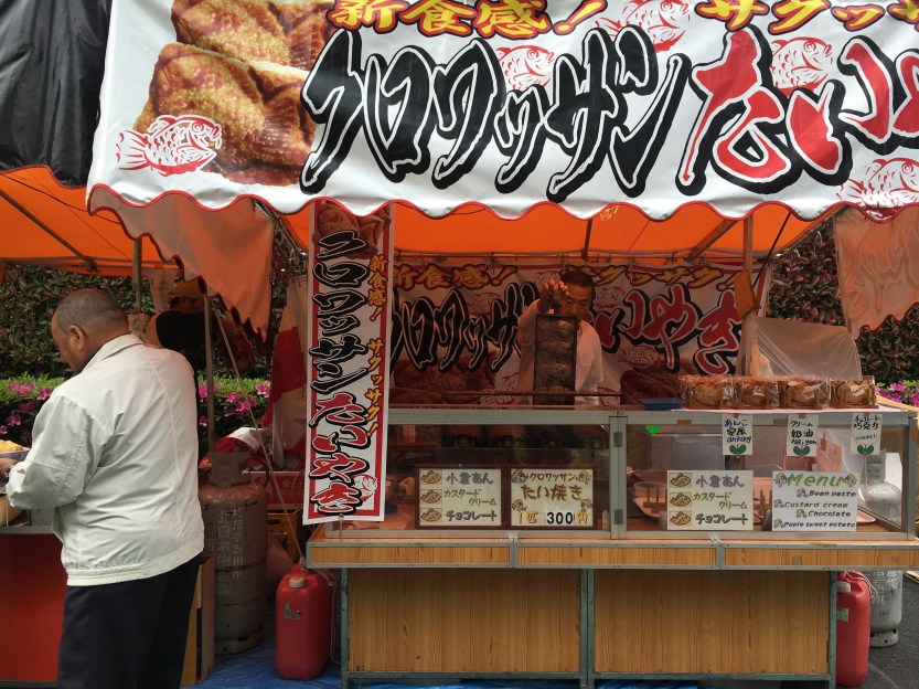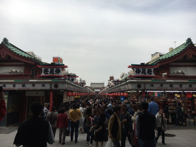 The next stop was a Sumida River cruise which led us to our final stop, the Asakusa Kannon & Shopping center at Nakamise. Nakamise is a street leading up to the oldest Buddhist temple in Tokyo. It was jammed back with vendors selling food and trinkets; clothes and jewelry. Artem, Jamie and I got a sweet treat from one of the booths. I’m honestly not sure what exactly I had eaten, but it was four small gooey balls of dough that were dipped in some powder that tasted to me like peanut butter. Typically you would eat that treat with sweet matcha tea.